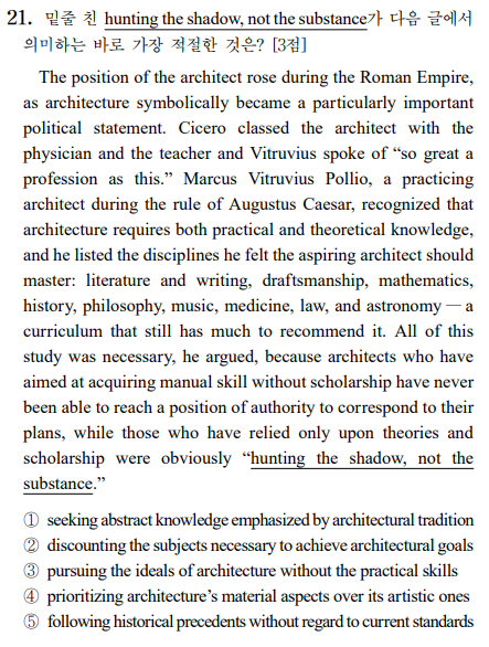| ① seeking abstract knowledge emphasized by architectural tradition | 건축 전통에서 강조되는 추상적 지식 추구 | ❌ 틀렸어. 여기서 전통이 강조되지 않았고, 추상적 지식이 목적이라는 점도 강조되지 않음 |